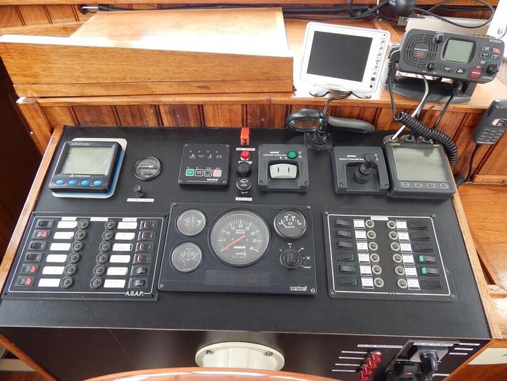 Hot water and additional heating is provided by immersion and Eberspacher Hydronic 5 kw diesel heater. Safety features include forward looking CCTV, Navman automatic pilot, navigation lights, Echomax radar reflector, stainless steel guardrails connecting with fixed steel rail around stern, grab rails on all cabin roofs, 25 kg Brittany anchor plus chain, winch controls on foredeck, throwing line, automatic man overboard light, 2 horseshoe lifebuoys, trumpet horn, and all accessories needed to safely take to the water.
