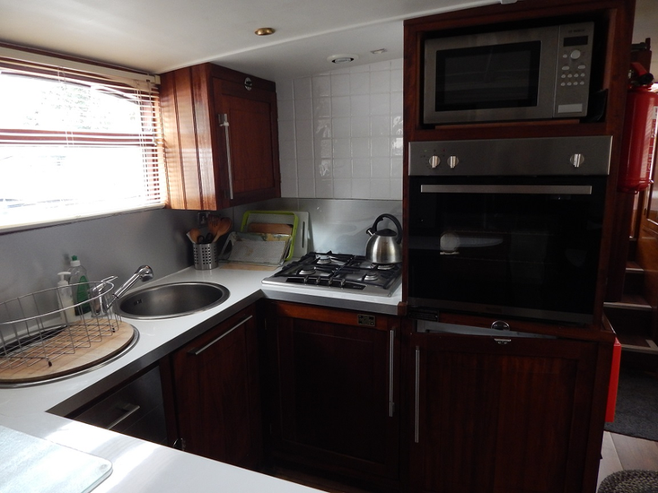 Forward of the wheelhouse is the galley and utility area containing a 4 burner hob, oven and grill, fridge with ice box, 900w microwave, stainless steel sink, mixer tap and drainer, and a Peninsula worktop with plenty of storage including a pull-out larder and utensils rack. A sideboard with drawers and cupboards, as well as locker space, Candy washing machine, and White Knight dryer stands to port. To starboard is another heads with shower, airing cupboard with calorifier below, electric flush toilet to holding tank, wash hand basin, and extractor fan.