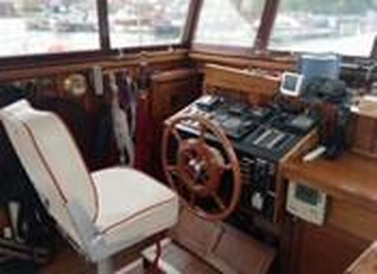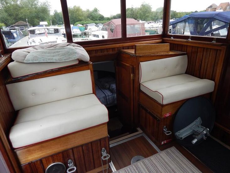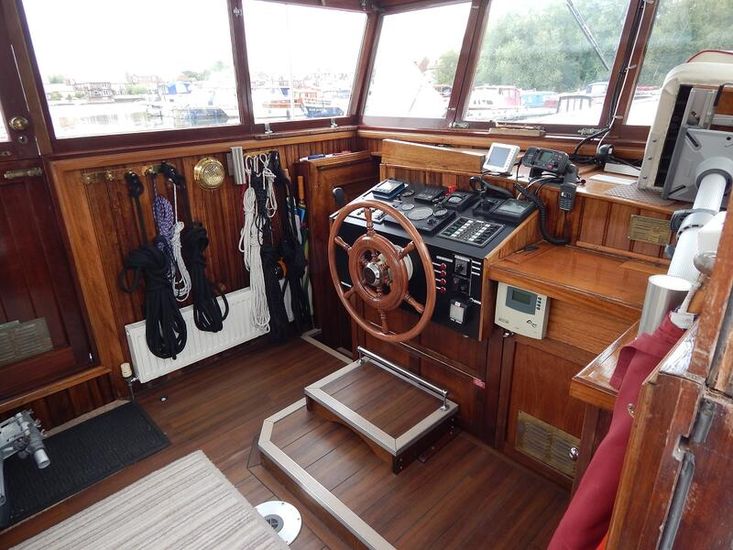The folding wheelhouse is constructed in solid iroko timber with double-glazed tinted windows and aluminium insulated roof panels. The fore and aft windscreens can be lowered independently of the sides and roof for cabrio style ventilation. Elsie Violet boasts a mahogany Vetus hydraulic wheel on a raised steering plinth to allow for better visibility when cruising, She has single lever engine and gearbox control and a host of instruments and gauges needed to navigate her, as well as 2 VHF radios – Ocean DSC/ATIS switching with speed, position and AIS display, and Lawrence DSC/ATIS switching with speed and position display, 24v and 12v switched fused panels, power isolating switches, bow thruster and winch controls, and a removable chart table with shelves and locker space below that holds major AC controls and consumer unit.
