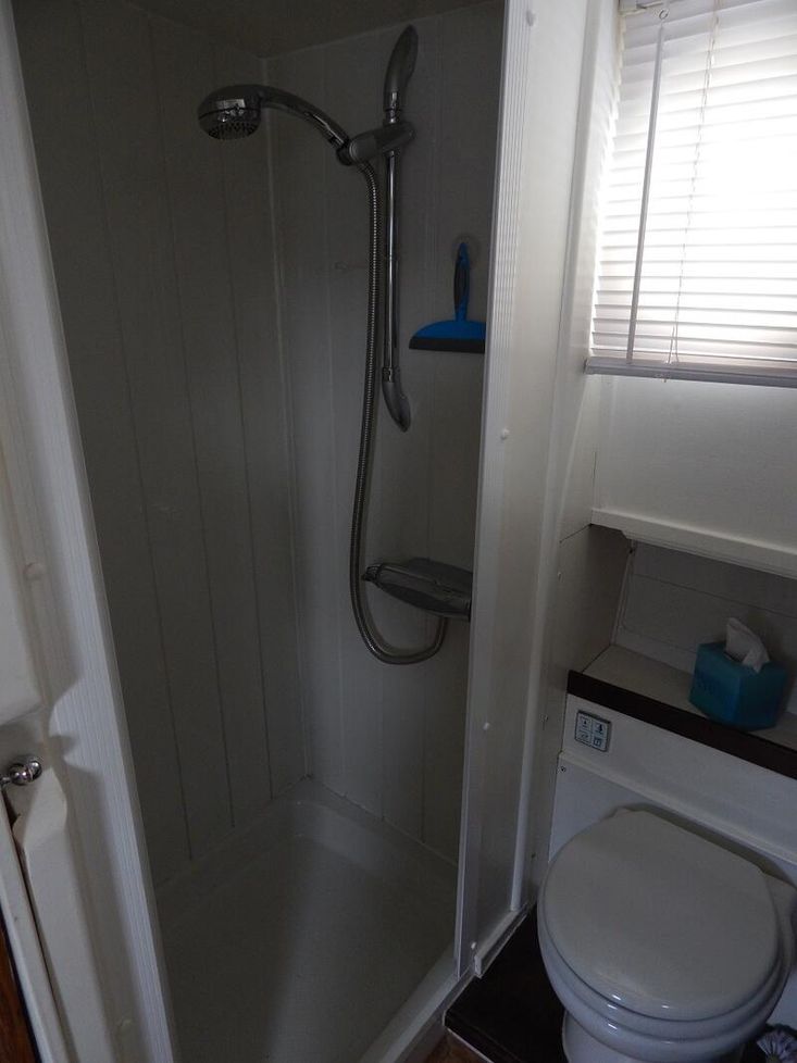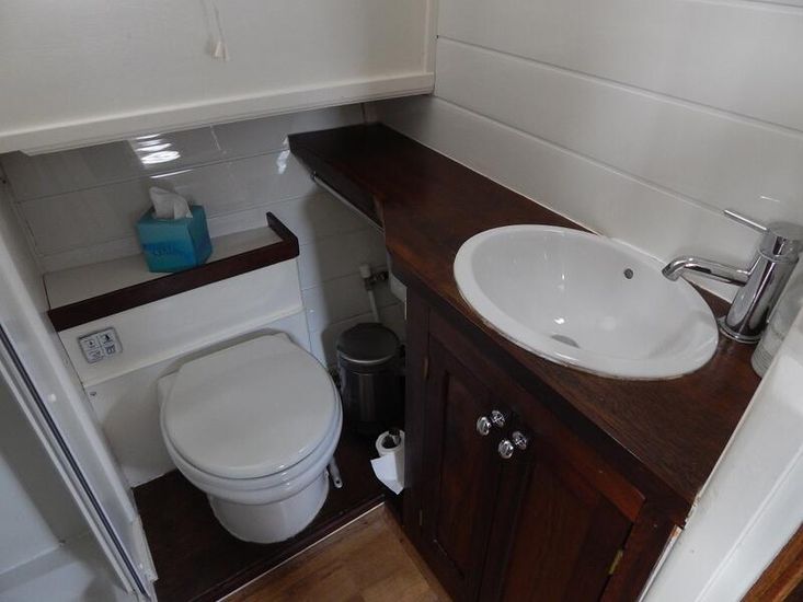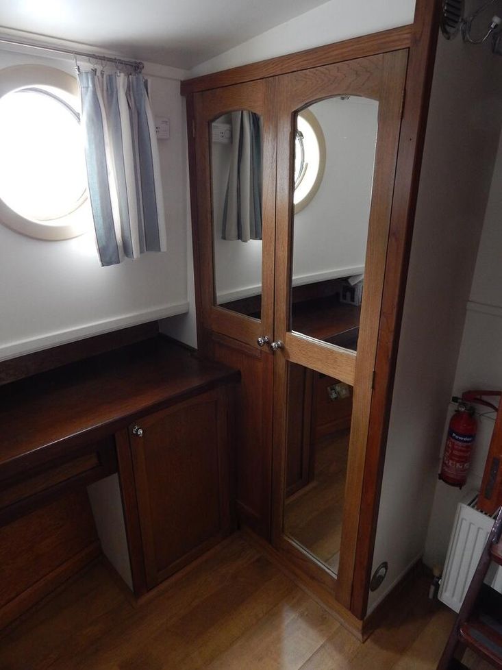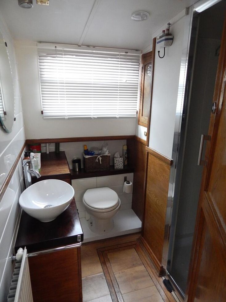 Access from the wheelhouse sternwards leads to a light and airy 'owners' cabin comprising king-sized bed athwartships with drawers, shelves, lockers and access to the weed hatch below. There is also a large full height hanging locker with mirrors on the doors, shelf/dressing table with drawer and locker below, a skylight/escape hatch leading to the aft deck, and an ensuite head consisting shower, electric flush toilet to holding tank, basin with cupboard below, and electric extractor fan. Grey water drains to a holding tank beneath which automatically pumps overside.