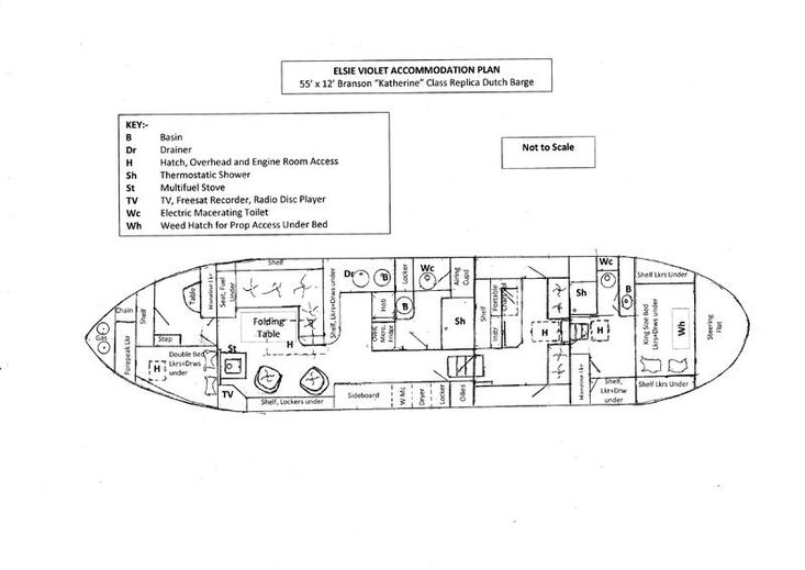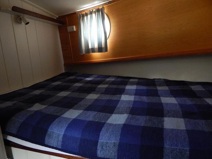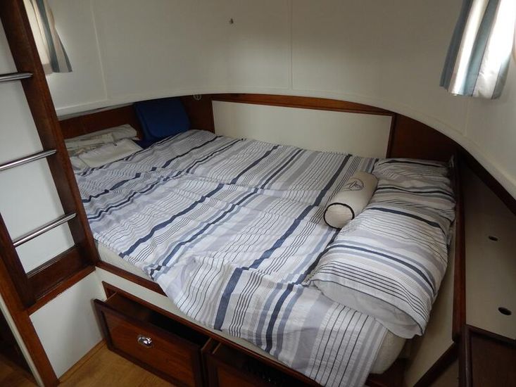 The fore cabin consists double bed 5' wide at the head with storage beneath, shelf / dressing table with cupboard below, small table with mirror, hanging locker, shelves, and storage for 2 folding chairs. An escape hatch leads to the foredeck.
