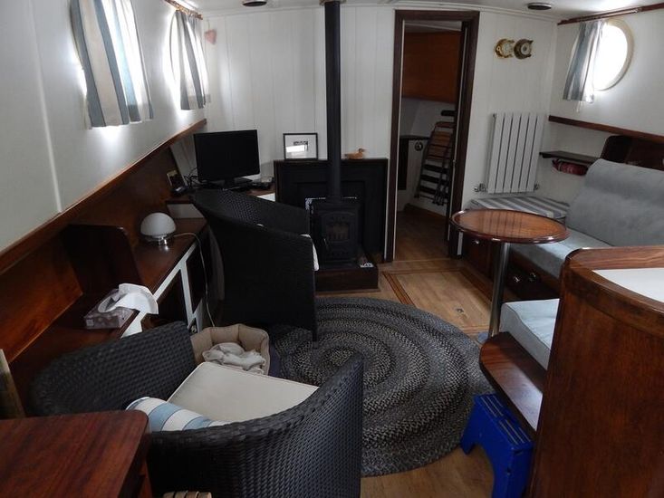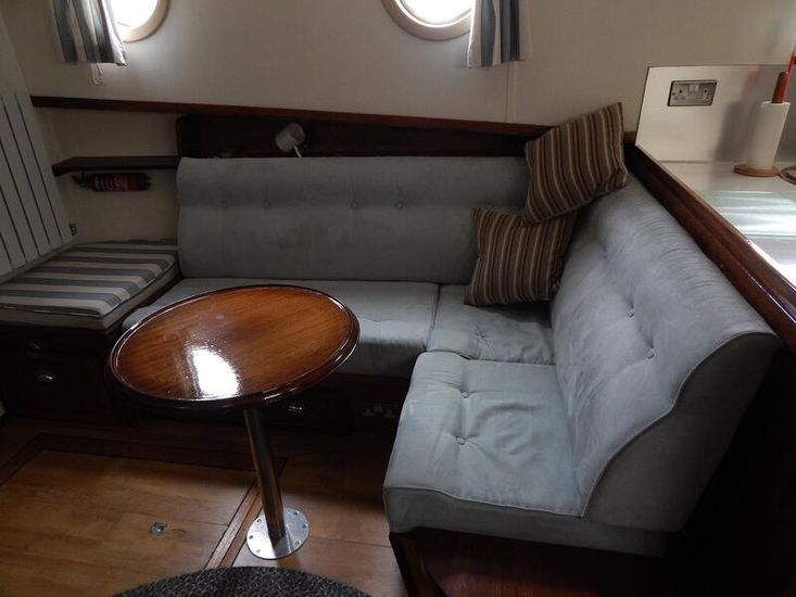 In the saloon there is a L shaped settee with Alcantara faux suede upholstery that converts to a double berth, 2 free-standing armchairs, removable folding table, flat screen TV / video disc player, Humax Satellite decoder and recorder, Sony radio / disc player and stereo speakers, a solid fuel Valor Arden 5kw stove with matching steel tiled surround and a seat to starboard with pull-out fuel bunker,. There is also a 4' x 3' loading hatch in the coach roof, 4 deck hatches and sun and insect blinds.